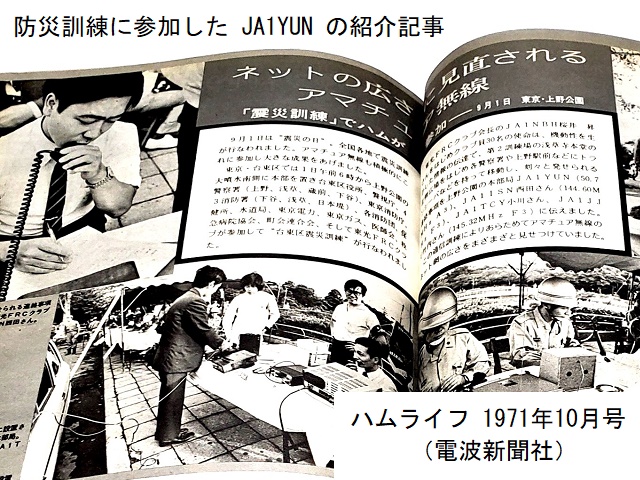 東京都台東区の地域アマチュア無線クラブ「東光 F.R.C.(JA1YUN)」と台東区(自治体)は、協力して地域のアマチュア無線クラブと連携する体制を整え、1971年に大規模な防災訓練(私も参加しました)を行い、当時のアマチュア無線雑誌でも紹介されましたが、1980年頃からこのような活動が行われなくなってしまいました。