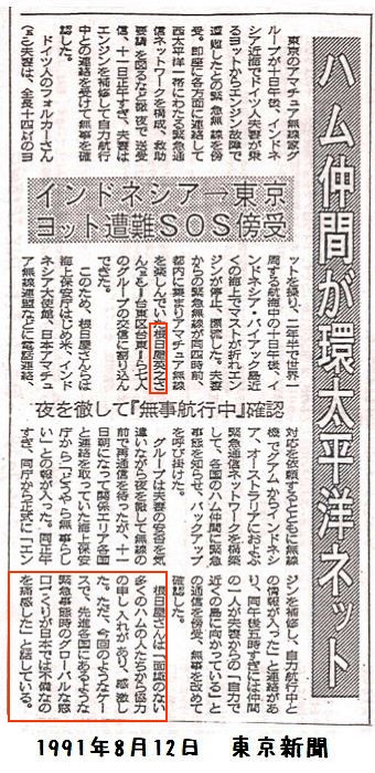 開局してから20年経った1991年8月に、ドイツ人夫婦が乗っていたヨットがインドネシア近海で漂流し、アマチュア無線で助けを求める「SOS」の電波を受信しました。 私は、そのドイツ人夫婦を救出するための 緊急通信ネットワーク を環太平洋のアマチュア無線家と立ち上げ、人命を救助する貴重な体験をしました。当時の私のアマチュア無線による人命救助活動については、新聞、日本アマチュア無線連盟(JARL)の会報、アマチュア無線雑誌などに取り上げられました。